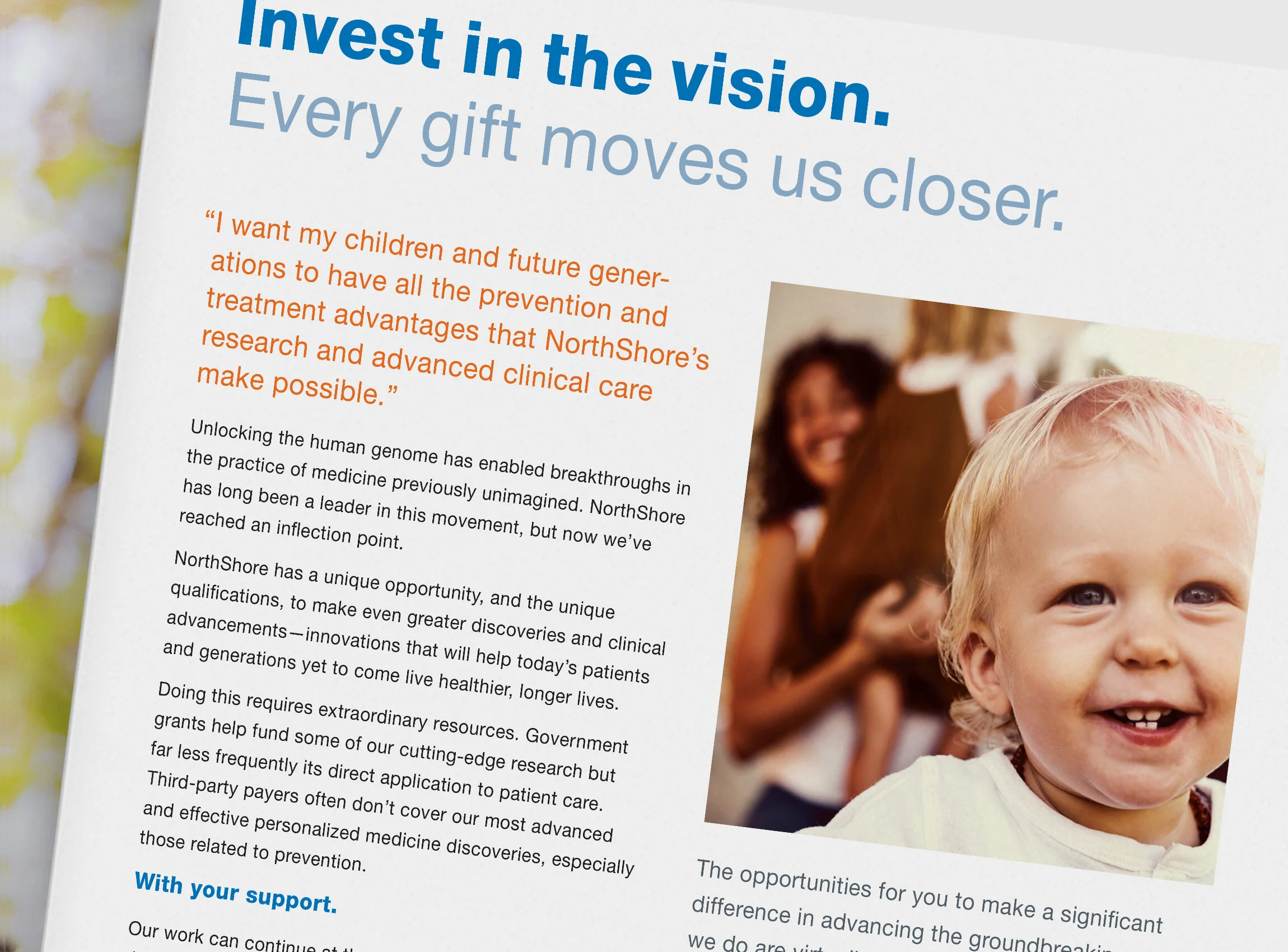 To develop a truly compelling case for support, we first took a deep dive into the subject matter to learn as much as possible about the evolution and impact of NorthShore’s groundbreaking application of personalized medicine on such an enormous scale. Our deeper understanding of the “reason to give” came in our interviews and interactions with the stakeholders in this still emerging area of medicine. This included building internal consensus among physician-scientists, organizational leaders, and gift officers as well as gaining the perspectives of those who had benefited from NorthShore’s brand of genomic medicine—patients, their families, and other potential donors.